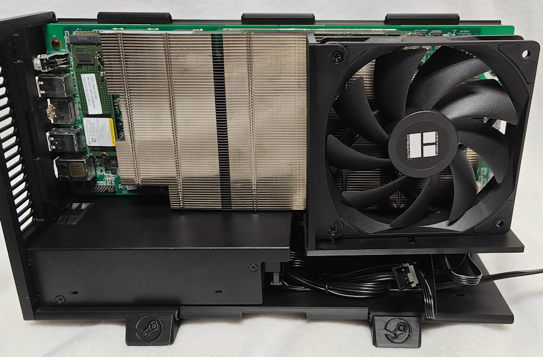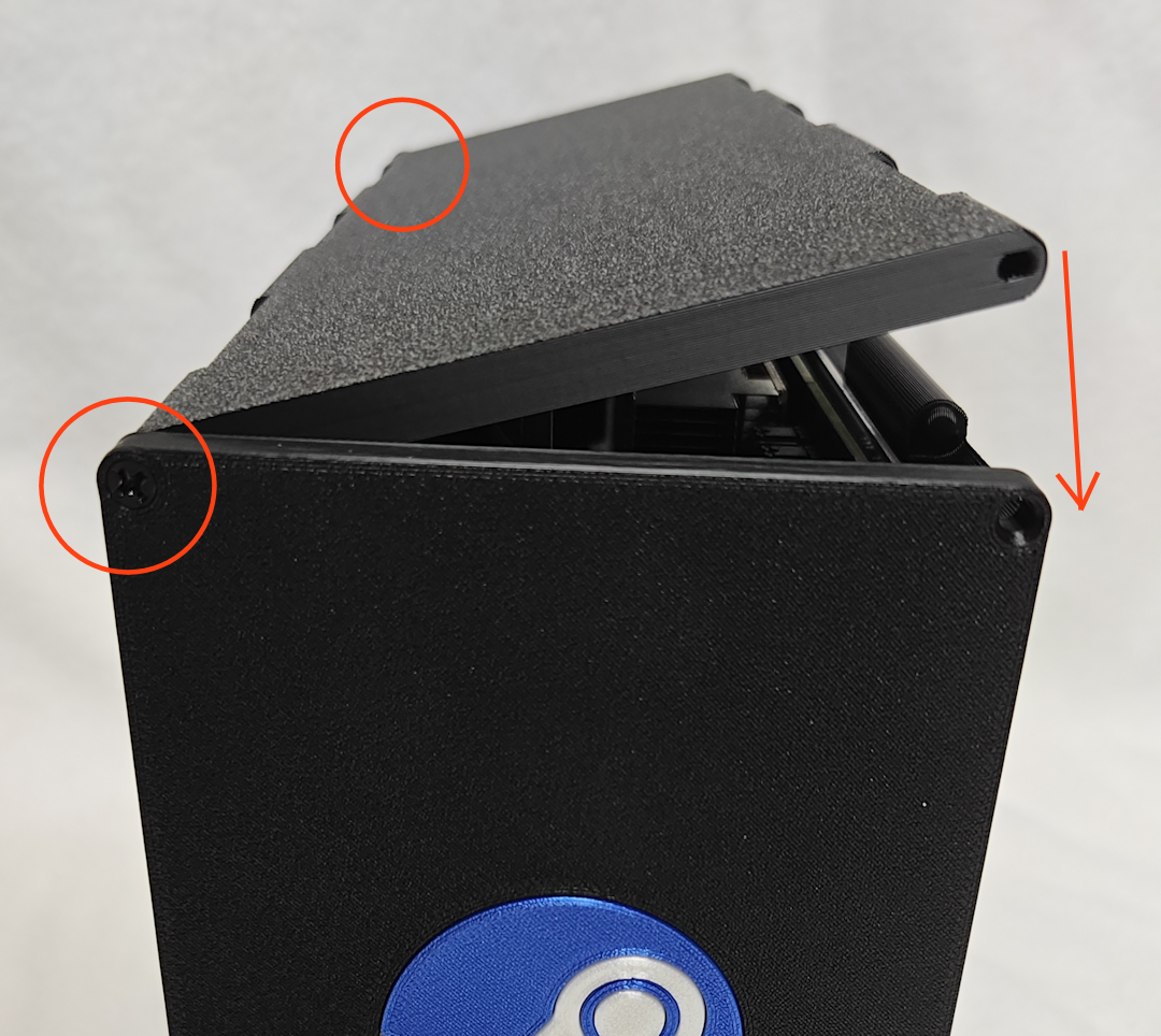 Tools ![]() Standard Phillips-head screwdrivers used in PC-assembly. Assembly Instructions Step 1. Snap together the Bottom Panel (#2) and Right Panel (#3) starting at one end and working across. Take your time, as this it can take some careful alignment and a bit of force. Once together, the edge should act as a hinge with the two panels positioned at 90-degrees. ![]() Step 2. Attach the Rear Panel (#1) using THREE M3-16mm Self-tapping Countersunk Screws (E). Don't over-tighten the screws as they can strip the plastic. Only tighten until the heads of the screws are flush with the surface of the Rear Panel. ![]() Step 3. Attach BOTH Feet (#11) to the Bottom Panel (#2) using TWOM3-10mm Self-tapping Pan Head Screws (F). Only tighten until the feet can barely slide from one side of the hole to the other. Leave them positioned toward the outer edge. ![]() Step 4. Prepare and mount the Flex ATX Power Supply (B) to the Rear Panel (#1) using THREE #6-32 UNC Screws (G). If you have a modular power supply, attach the PCIE 6+2-pin Cable (I) and Power Switch Cable (J) first. Since power supplies vary, your wiring between the power supply and power switch can be different, but the intent of the switch is to bridge the PS_ON wire (typically the green wire on a 24-pin connector) with GND (black wire), which will start the power flowing into the BC-250 board. WARNING! Incorrect wiring can damage the power supply and BC-250, so please exercise caution and consult the Power Switch Wiring Guide for assistance. ![]() ![]() ![]() Step 5. Attach the PCIE 6+2-pin Cable (I) to the BC-250 (A), and then attach the BC-250 (A) to the Right Panel (#3) using FOUR M3-10mm Self-tapping Pan Head Screws (F) and to the Rear Panel (#1) using the tiny M2-3mm Countersunk Screw above the DisplayPort connector. ![]() ![]() ![]() ![]() Step 6. Assemble the intake fan duct using Inner Duct Walls (#9, #10), ONE Intake Fan Mount (#7) and ONE 120mm Case Fan (C). Before securing the fan with TWO Self-tapping Fan Screws (H), route the fan's power cable through the rectangular hole in the Inner Duct Wall (Bottom). NOTE: The fan should be oriented so that it blows toward the BC-250. NOTE: The wider opening on the Fan Mount should face the nearest edge so that the heads of the Fan Screws sink below the surface when secured. ![]() ![]() Step 7. Plug the Intake Fan (C)'s power connector into the BC-250 (A)'s fan header, and then attach the fan duct assembly using the slot toward the bottom of the Right Panel (#3). No screws are necessary for this step. NOTE: If using a fan splitter cable, connect that to the BC-250, and then connect the fan to the fan splitter cable. ![]() ![]() ![]() ![]() Step 8. Attach the final Intake Fan Mount (#7) to the Front Panel (#6) using the slots closest to the edge. Next, insert the Power Switch (D) through the front surface (below the Steam logo), so that the electrical contacts will be inside the case. It should snap into place with a little pressure. NOTE: The wider opening on the Fan Mount should face toward the nearest edge of the Front Panel so that the heads of the Fan Screws sink below the surface when secured (in the next step). ![]() ![]() Step 9. Attach the Power Switch Cable (J) to the Power Switch (D). Next, attach the Front Panel (#6) using THREE M3-16mm Self-tapping Countersunk Screws (E). Then secure the Intake Fan to the Intake Fan Mount (#7) using TWO Self-tapping Fan Screws (H). ![]() ![]() ![]() Step 10. Snap together the Top Panel (#4) to the Right Panel (#3). As with Step 1, this requires a bit of alignment and force, but if you start with one end and work toward the other, they should snap together fairly easily. Use FOUR M3-16mm Self-tapping Countersunk Screws (E) to secure the Top Panel (#4) in place. NOTE: If you're struggling with this step, it can help to secure the Top panel to the corners of the Front and Rear panels first (near the open Left side), which should give you the correct alignment and sufficient leverage to snap the Top and Right panels together. ![]() ![]() Step 11. Attach the Exhaust Fan Mount (#8) to the final 120mm Case Fan (C) using TWO Self-tapping Fan Screws (H). Next, attach the Exhaust Fan Mount (#8) to the Rear Panel (#1). Then connect the Exhaust Fan (C)'s power connector to the pigtail of the Intake Fan (C) (or fan splitter cable). NOTE: The fan should be able to swivel out of the way to provide access to the M.2 slot, and rest at an angle on the tiny shelf protruding from the Top panel. ![]() ![]() Step 12. Tuck all of the cables inside and snap together the Left Panel (#5) to the Top Panel (#4). As before, work from one side toward the other until it works as a hinge. Finally, secure the Left Panel (#5) to both the Front Panel (#6) and Rear Panel (#1) using the last TWO M3-16mm Self-tapping Countersunk Screws (E). Slide the Feet (#11) toward the center. ![]() ![]() Step 13. Start gaming! |